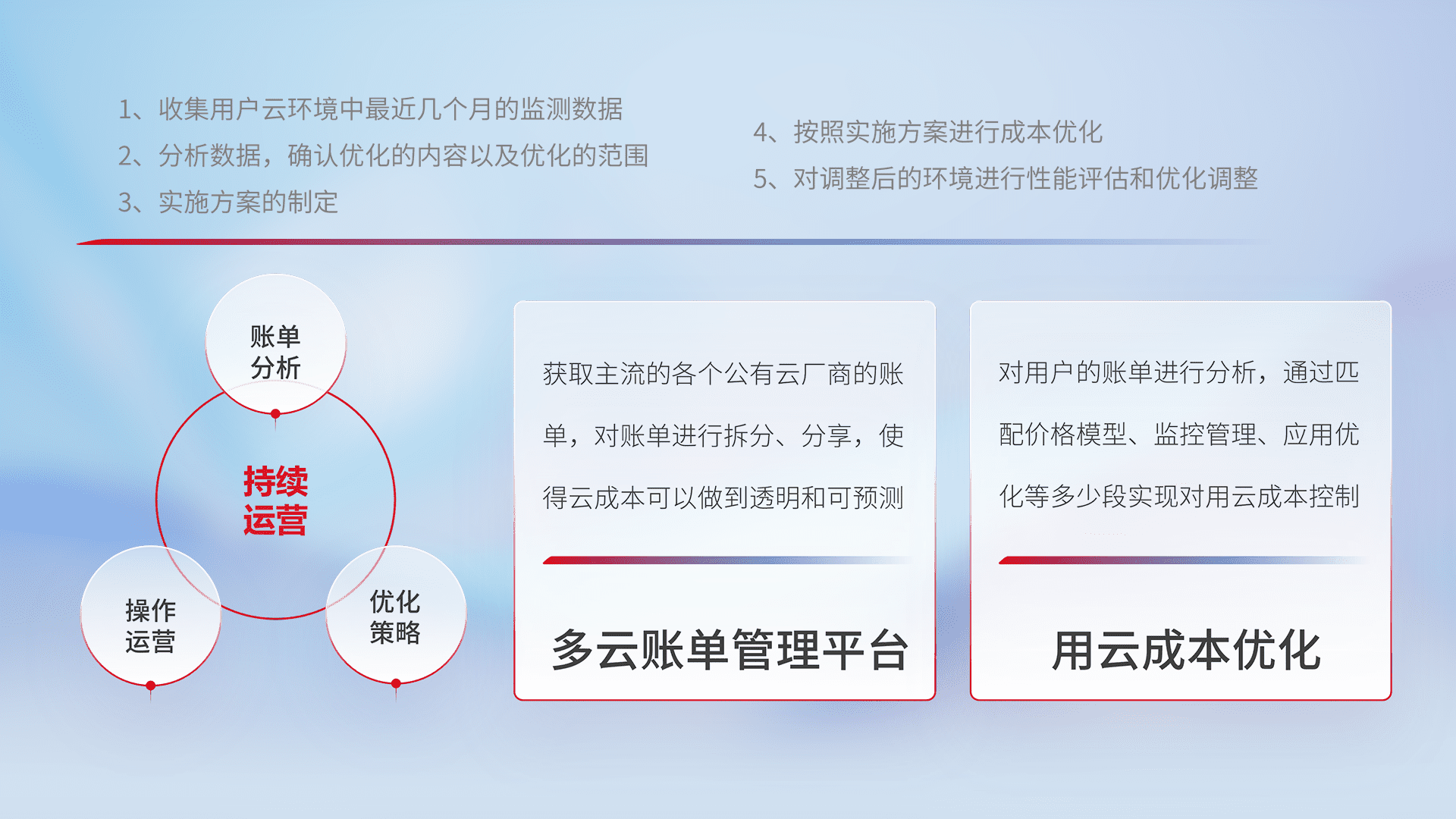 通过多云纳管,,,,以统一的资源数据模型把客户的云资源进行抽象和封装,,,,进而实现对多云资源的统一操作,,,保障云资源管理的可靠性、、、稳定性与可用性。。。量身定制化运维内容,,,,配置、、、开发运维、、、、补丁管理、、备份、、、、监控、、、、认证和访问管理、、、审计和日常巡检等,,,,保障在用云过程中的可靠度,,,稳定度以及高可用率。。。。