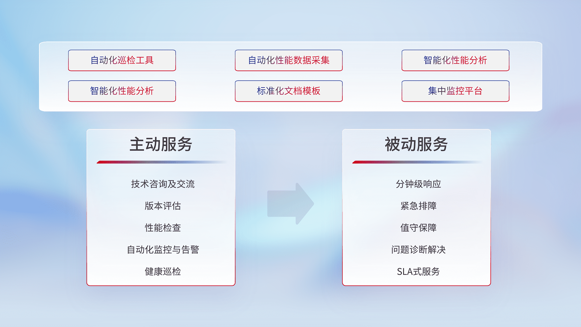 智能化工具和标准化文档,,保障服务质量,,,,提供主动服务(包含技术咨询、、、、版本评估、、、、性能检查、、、、自动化监控与告警、、、、健康巡检)和被动服务包含(分钟级响应、、、紧急排障、、值守保障、、、、问题诊断解决、、、SLA服务)。。。
